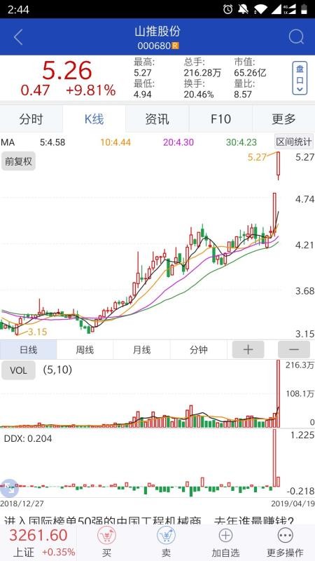 4、进入股票行情,查看股票的K线内容,了解股票涨跌趋势,快速买卖