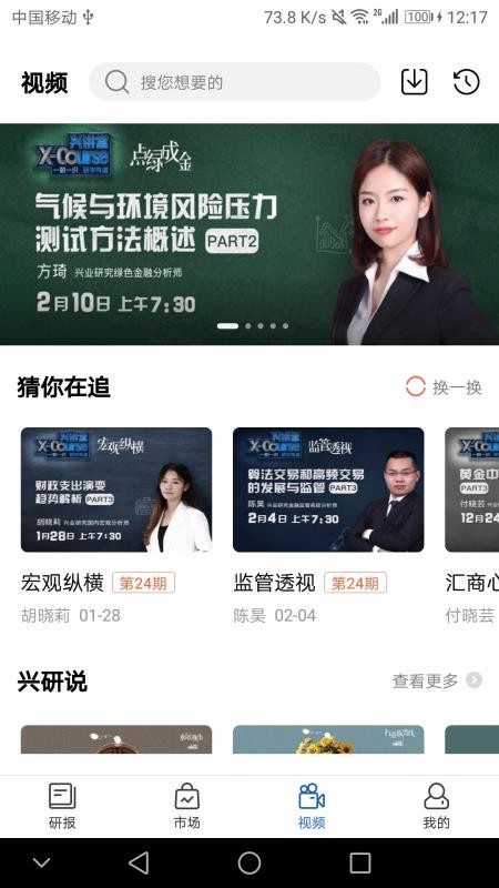 兴业研究app是一款金融投资理财研究类软件,主要为用户们提供各种理财投资资讯消息,还设置了视频教学中心;用户在该平台上能看到最新的金融理财相关新闻资讯消息,同时还能在市场中心页面看到最新的新债券等多种数据资料内容,有了这些数据和资讯后就能帮助用户更好地做好投资理财规划;如果用户对于金融理财方面的知识不太了解的话还能在视频中心学习,该中心为用户带来了众多的投资风险相关课程资源,还有各种理财监控和投资分析等视频课程内容,满足不同用户的投资理财学习需求,随时随地都能提升自己的理财技能。