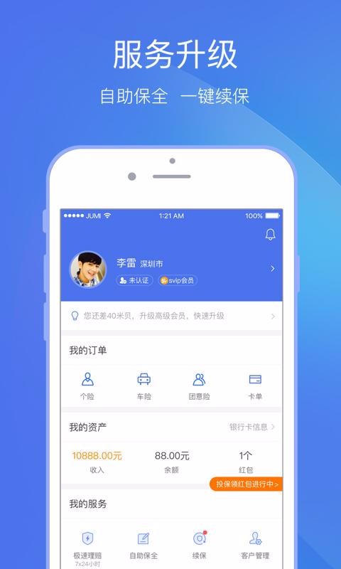 6、详细的记录个人的订单和服务,了解个人账户的情况,服务更完整,享受更舒适的服务,保险管理更便捷;