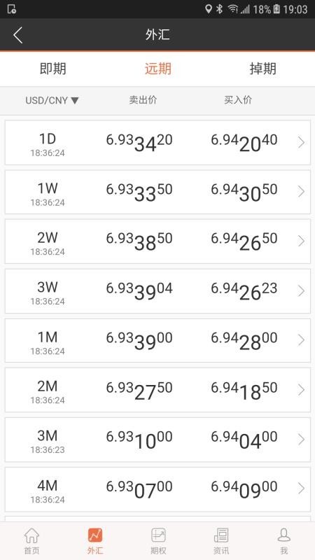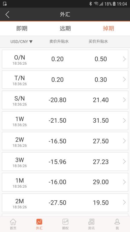 4、在这里,用户能够看到多种类型的外汇行情信息,包括即期、远期和掉期三种;