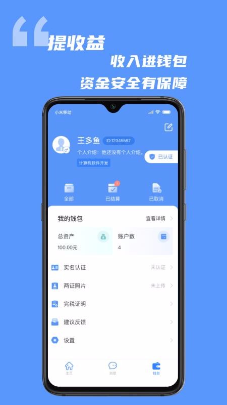 5、切换到个人中心并查看钱包数据,或查看下面的认证列表完成状态后挑选完善认证