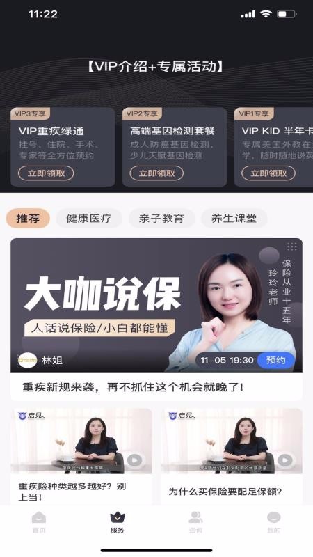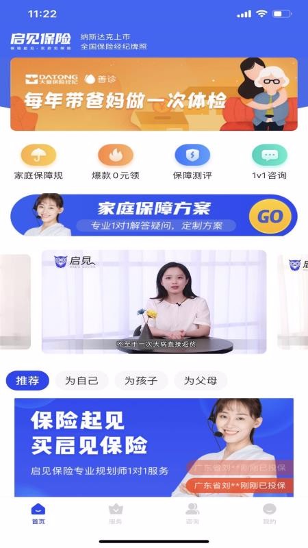 启见保险app是一款保险服务办理软件;该平台提供专业的一对一解答问题功能,可以为用户定制方案,从而享受更优质的家庭保障方案;同时,这里还有保障测评功能,可以随意选择测评,能够及时获取测评结果;可以为自己、为孩子以及为父母选择更合适的保险;该平台还会推送大咖直播,可以选择预约观看直播,能够及时获取更有价值的信息;还可以自主观看不同类型的视频,健康医疗、亲子教育以及养生课堂应用尽有;该平台致力为用户打造更加全面的保险服务环境,需要的朋友赶紧下载尝试吧。