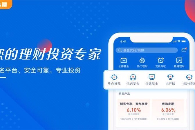 基金大师是一个提供投资理财服务的平台,在线即可进行投资交易,还可以查看各种行情、财经资讯、投资知识等;优选榜单进行推荐,选择股票、混合、货币、债券等分类即可查看相应的排行榜,便捷了解上榜的投资产品,可以选择周期查看涨幅;选择合适的产品进入详情页面,即可查看显示的收益走势和单位净值,也推送了关于该产品的资讯信息;随时更新并推荐明星产品,也可以选择优选基金、海外精选、指数基金等专区进行浏览,也提供了定投服务;拥有专门的定投学堂,从入门到精通,提供了对应的学习内容,随时可以开始学习并了解更多定投知识。