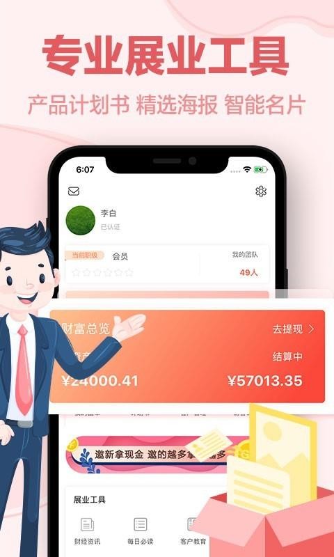 4、设置有专业的展业工具,提供齐全的展业够工具,包括财经资讯、,每日必读和客户教育等;