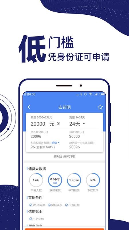 小额贷款花app是一款手机贷款软件,能够为用户提供大量的贷款项目,拥有各种优质的贷款产品,你可以根据自己的需求在这里自由的选择,并且这里的贷款产品放款快,信用额度高,门槛低,还可以更好的保护你的个人信息,不会泄露你的各种隐私,让你可以放心的在这里借款;用户只需在这里填写自己的个人信息就可以快速的进行申请,并且审核速度十分的迅速,审核成功后能够根据用户的征信情况自动的为您匹配你的借款额度,让你可以快速的一键借款,轻松的得到自己的借款金额,更好的解决你的用钱需求。
