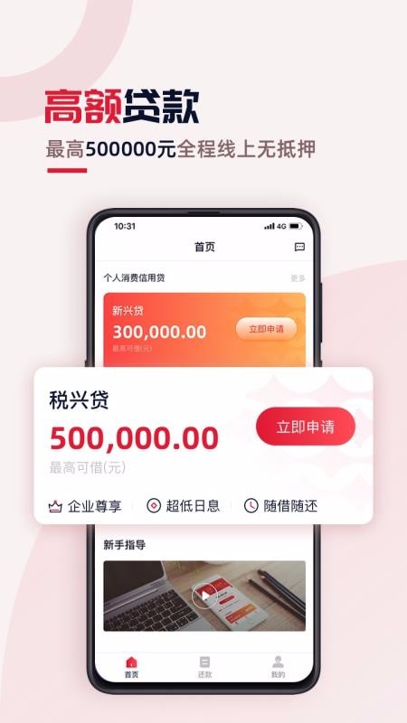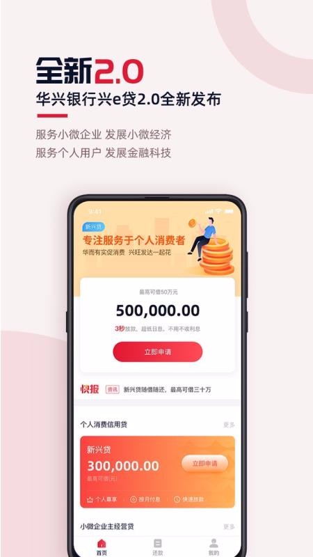 兴e贷是一个提供线上金融借贷服务的平台,包括个人消费信用贷和小微企业主经营贷,满足了各种用户的借贷需求;分类选择合适的贷款产品,并查看显示的最高可借额度,同时也提供了新手指引,查看借贷流程和要求之后,即可开始申请;在申请过程中,可以任意的选择借款金额,也可以一键全部借出,并完善借款账号、借款用途、借款周期、还款方式等信息,编辑完信息后即可提交该申请;随时可以查看申请审核的进度,放贷完成后,即可查看还款进度,为你提供了金融日历,根据日期查看还款安排,实时显示待还款和提前还款金额,也会自动推送还款提醒。