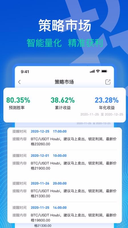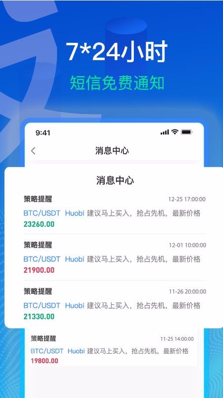 币投君是一款比特币专用投资服务平台,为用户提供货币资讯、买卖预测以及资金流向监控等服务;其中创建了策略市场、消息中心以及抢先赚钱多种丰富的中心页面,可以在策略市场中看到货币预测胜率、累计收益以及年化收益等多种丰富的数据内容,还可以看到下面实时的提醒消息资料,里面有非常精确详细的建议说明文字,用户可以根据该建议确定是否卖出货币;在消息中心实时将最新的策略提醒以摘要的形式推送展示,点击其中一条信息就能立即打开进入到策略市场中查看该消息详情,通过其中摘要也可以及时判断自己的投资方向。