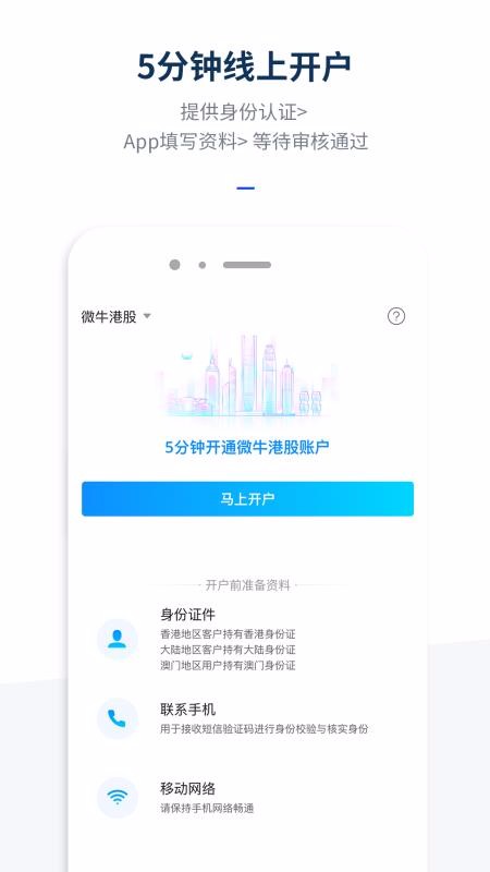 微牛是一款线上理财交易软件,支持港股、期权以及ETF等多种服务项目,为用户提供了便捷的在线开户功能;用户在开户之前可以通过下面的开户前主播资料说明中看到其中丰富的说明内容,根据该说明进行相关的资料准备,避免因为资料不足而导致不必要的重复开户操作;通过该软件能实时看到最新的股市行情信息,还能选择单独的产品查看其收益变动图,利用该图中展示的变动状态可以大致掌握该股票内容规律;在交易产品详情页面中不仅能看到清晰的统计走势图,还能看到最新报价新栏内容,或查看关于该股票信息的最新新闻。