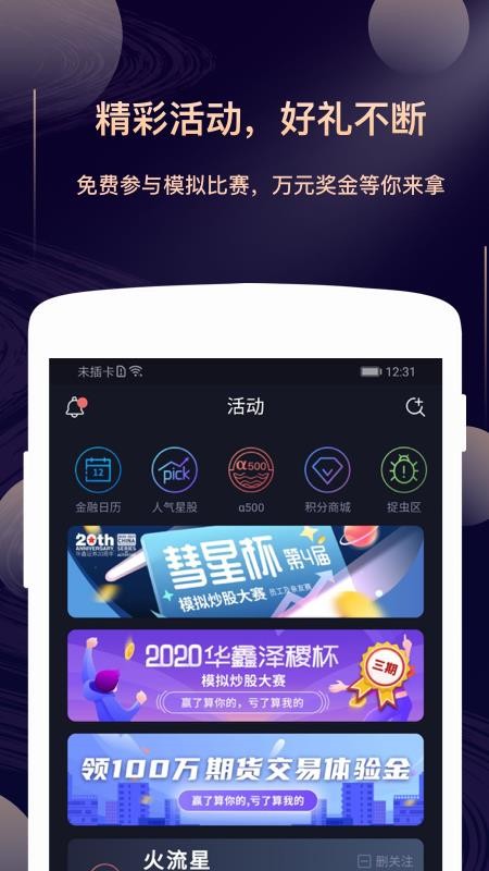 星途starway是一款投资炒股软件,让用户能够找到各种市场的投资产品,在线进行产品交易;应用中有多种功能,用户可以在这里找到各种投资相关的活动信息,选择自己感兴趣的投资活动进行参加,向别人展现自己的投资天赋;用户通过软件能够找到各种开户和交易功能,帮助用户更加轻松的交易各种产品,让投资变得更加方便简单;在这里,用户还可以找到各种各样的特色服务内容,通过各种服务帮助用户抢先了解各种动态,让用户能够抢占先机;快下载这款软件试试吧,更加便捷的进行投资炒股,轻松交易各种产品。