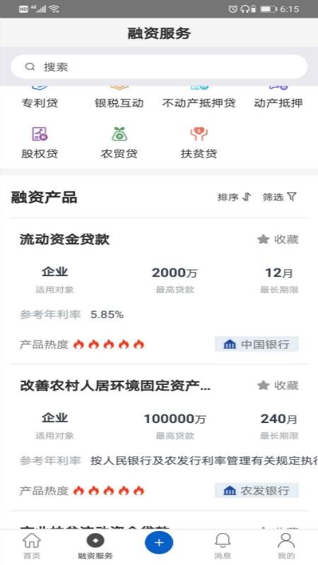 3、点击融资服务,查看各种类型的贷款信息,选择合适的贷款产品提交申请