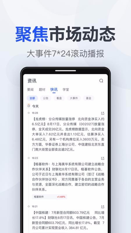 5、设置丰富的快讯筛选标签,该栏下面有公告、看盘以及大事件多种类别标签;
