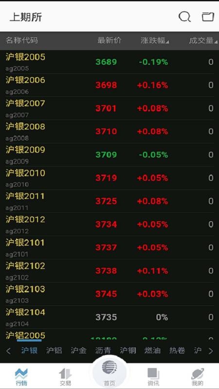 3、点击行情,查看不同类型的期货产品行情信息,了解最新价格和涨跌幅还有成交量情况