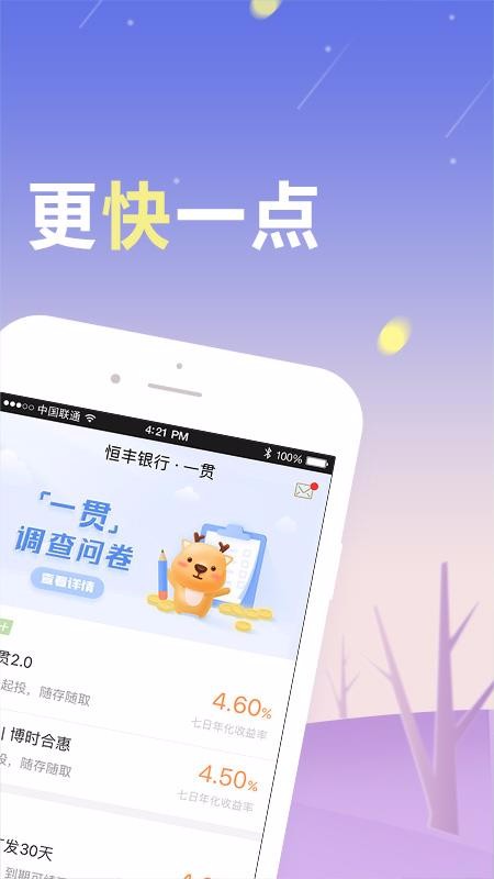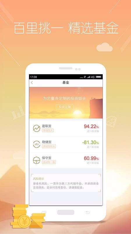一贯是一个金融理财平台,让用户在线进行理财投资,轻松获取丰厚的收益;精选产品进行推荐,选择合适的产品可以查看详细的数据和信息介绍,选择进取型、稳健型或保守型即可查看推荐的基金产品,相应的也提供了风险提示;选择产品即可进行购买和投资,自动保存投资记录,并实时展示收益数据,包括收益金额、亏损金额等;随时可以查看总资产,了解现金余额,可以添加银行卡进行提现,同时该软件无需使用银行卡进行充值,可以直接使用银行卡进行投资;还可以在该平台中存工资,工资到账立即理财,让你坐等收益。