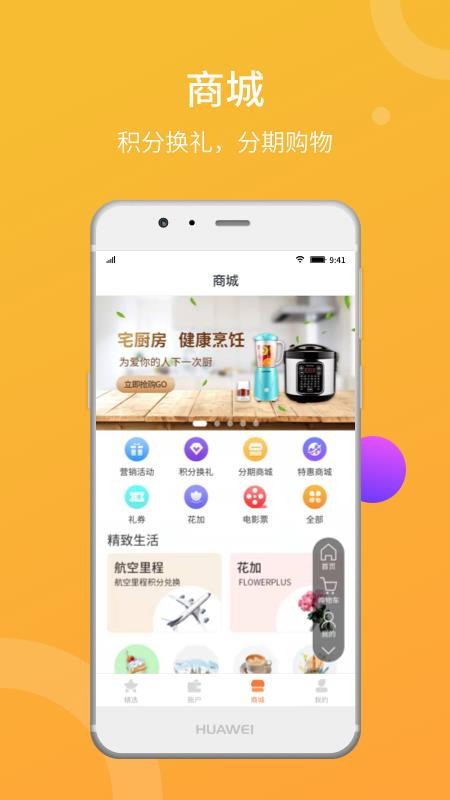 4、进入商城,查看各种类型的商品信息,使用积分兑换各种商品,分期购买商品