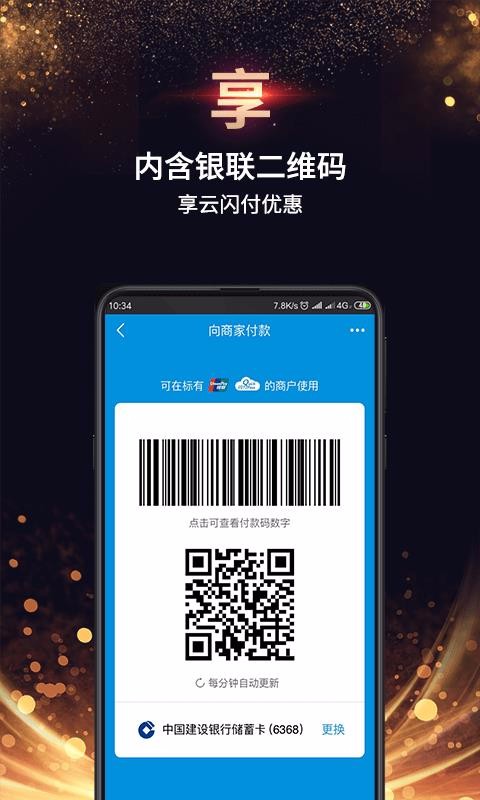 2、提供了银联付款码,点击可以查看付款码数字,并自行更换付款银行卡;