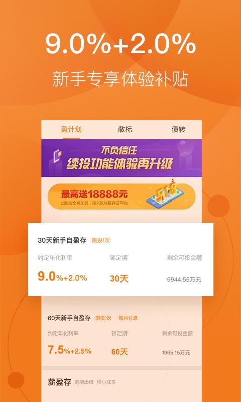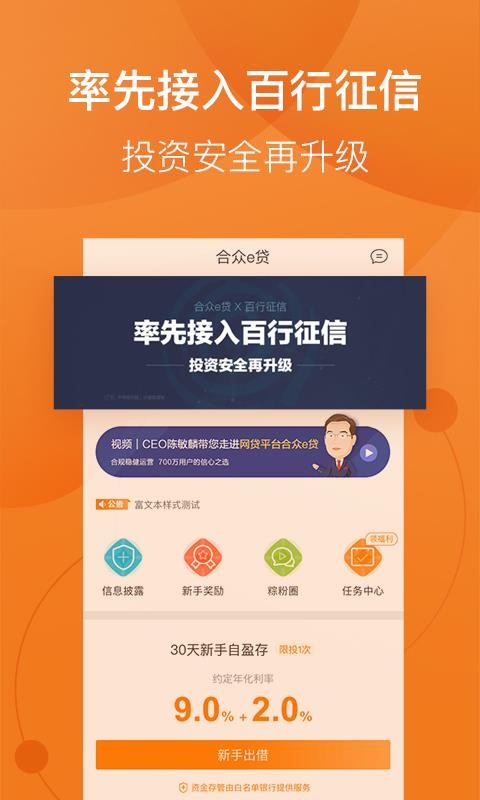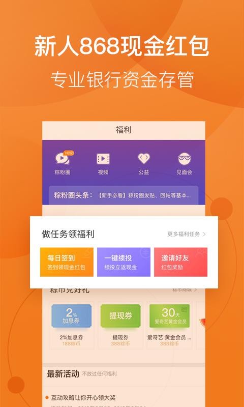合众e贷财富是一款投资贷款理财软件,为方便用户投资和借款,软件设置有盈计划、散标、债转三个专区,在各个专区中展示不同的借款产品信息,用户可以阅读产品的内容, 掌握投资产品的主要信息,了解约定年化率、锁定期和剩余可投金额等信息内容, 根据自己的情况选择;在软件中还提供很多任务领福利的信息,包括每日签到、一键续投和邀请好友,完成任意一项都可以获得该任务的福利,享受福利服务;同时还提供很多投资活动的信息内容,并推送热门的资讯信息,随时阅读了解金融行业的动态;感兴趣的朋友赶快下载使用。