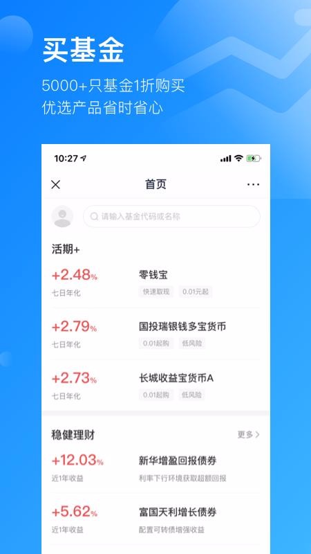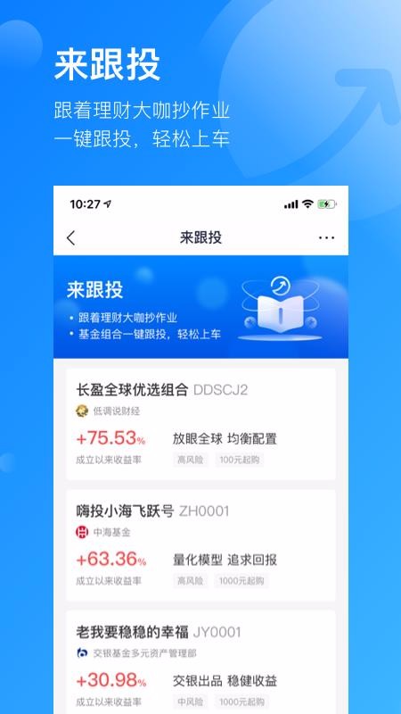 头号理财app是专业的金融理财服务软件;这里提供超多理财产品,支持用户随意选择投资理财;同时,该平台还提供来跟投功能,可以直接跟着大咖进行投资,致力于帮助用户获得更多的收益;实时推送热门板块,用户可以自主选择查询相应板块,能够及时接收最新投资讯息;推送基金排行,随时可以浏览最新排行详情,还可以参与定投,直接查看平台推送的定投优选产品后即可一键点击定投;支持用户直接输入基金代码或者名称检索查看基金,助力用户更轻松的掌握相应基金信息,需要的朋友赶紧下载试一试吧。