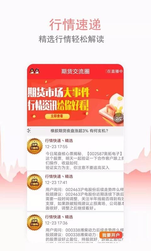 期货交流圈app专注于查询期货资讯;用户可以使用这款软件随时查询行业资讯,助力用户及时掌握更多有价值的讯息,从而更高效的投资理财;同时,该平台还提供期货交流圈,可以直接查看大咖分析信息,让用户更充分的了解行情;这里还提供财经要闻,实时更新推送要闻,可以直接浏览综合新闻信息;提供在线开户的功能,用户可以自主选择一键开户,更快捷的审核,节省更多的等待时间;这里的各种信息不断更新,各种数据实时统计分析,助力用户轻松掌握财经大事件,需要的各位朋友赶紧安装开始查询吧。