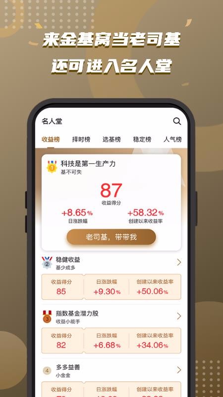 金基窝是一款基金申购服务平台,这里为用户提供基金购买操作说明,还汇集了海量的优质好基金资源;软件中设置了名人堂专区,里面划分了不同的榜单展示栏目,包括收益榜、择时榜以及选基榜等多种丰富的榜单栏目,可以选择相应的榜单并查看其中的数据排行,每一个排行封面上都显示了不同版块的来源信息,还展示相应的收益得分等数据内容;除了能看到各种榜单的排序情况之外,还能从榜单中进入到某个排名较靠前的基金收益详情页面,在该页面中能看到历史业绩走势情况,还能切换不同的时间段并查看相应的波动标准。