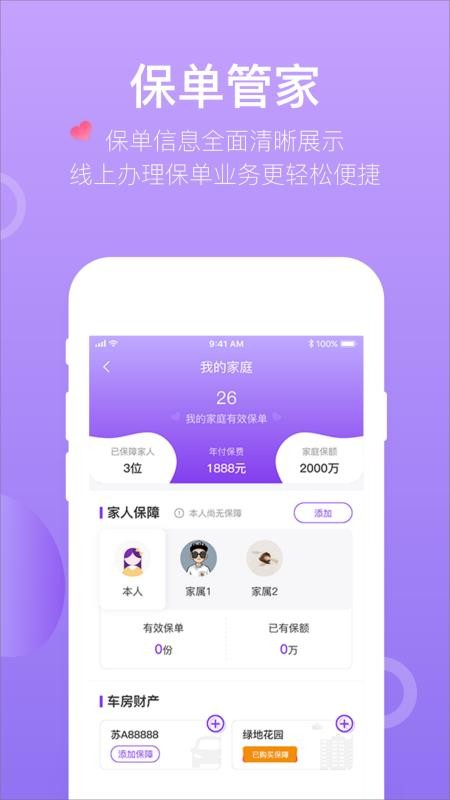 3、点击我的家庭,查看自己家庭的保单和保额信息,快速管理自己的车房财产