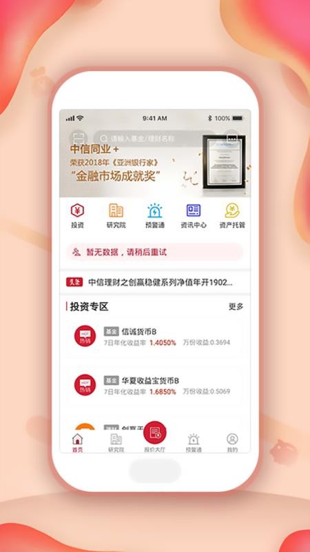 中信同业+app是一款移动理财服务平台,让用户能够了解各种投资信息,安全放心的进行交易;应用中有多种功能,用户可以在这里找到各种类型的投资产品,了解各产品的收益情况,通过对比购买更加合适的产品,高效投资;用户通过软件能够找到各种研究内容,快速了解最新研究报告信息,掌握市场最新动荡情况,学习更多的投资策略;在这里,用户还能够清晰看到各种预警信息,根据预警避开各种高风险的投资产品,防止自己出现投资损失,提高自己的收益;快下载这款软件试试吧,掌握投资市场动态,更放心的投资。