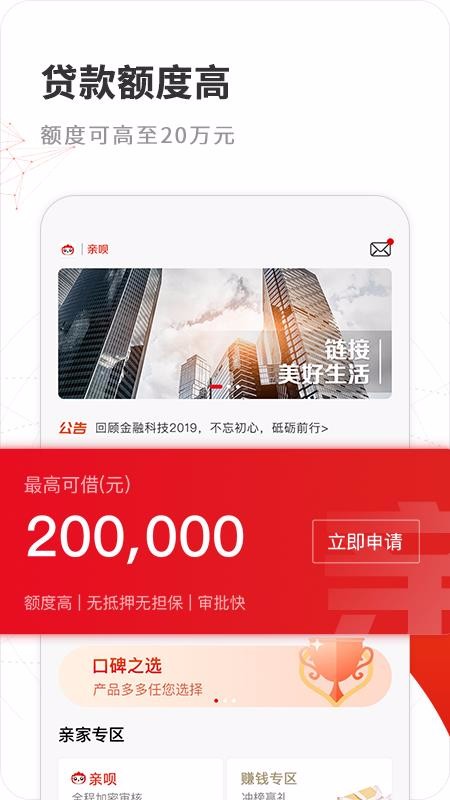 亲家app是一款安全的借款平台;平台提供明确的借款流程,致力于帮助用户轻松借款,从而有效的解决借款的问题;在这里,借款无需繁杂的操作,只需要实名认证即可快速的申请,申请通过即可快速到账,使用资金更方便;借款更快捷还款更自由,支持的还款方式多样化,用户可以随意选择,帮助用户减轻更多压力;支持的借款额度非常高,选择额度更自由,利息透明化,有效的维护用户的借款权益,个人信息不会轻易泄露,让用户借款更省心;这里还有超多丰富的内容,赶紧下载解锁更多功能享受超低息贷款吧。