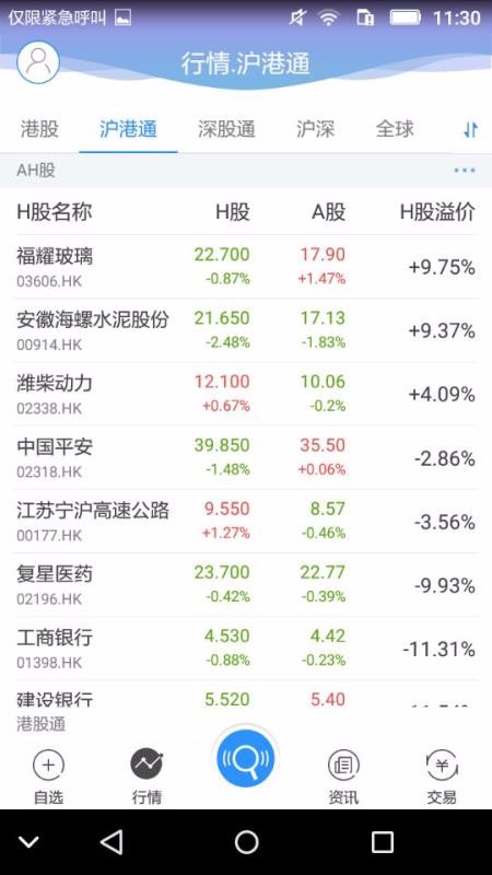 5、用户可以根据分类选择查看行情,支持选择港股、沪深或者全球行情等;