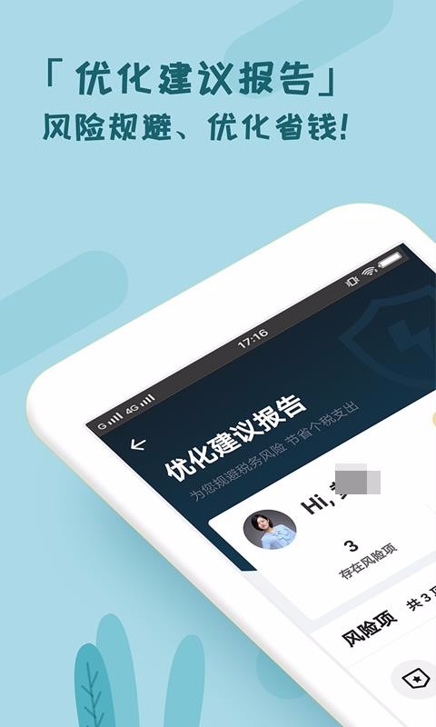 1、拥有专业的风险建议报告,规避风险,优化省钱,检测的流程也简单;