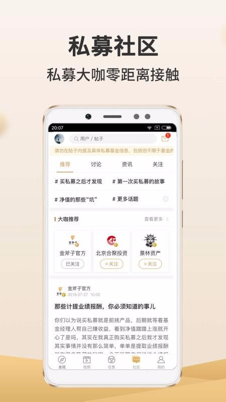 金斧子财富是一款为投资者们量身打造的投资理财服务软件,其中有丰富的在售产品资源,还开设了私募社区中心;在私募社区中可以查看其中丰富的推荐资讯动态资源,通过这些动态内容可以看到理财大咖们对相关产品的详细分析,也能从这些动态内容掌握最新的投资金融市场行情状况;私募社区里面还划分了讨论与资讯栏目,切换到讨论栏后可以看到里面所有投资者们最近热议的话题内容,支持按照自己的兴趣参与到相应的话题中讨论;用户还能从资讯栏目中通过官方推送的资讯新闻查看其中的相关资讯内容,筛选有价值的信息并判断市场行情。