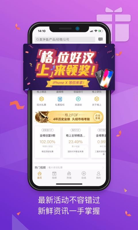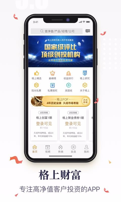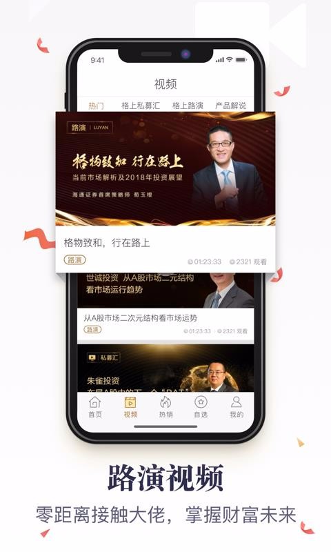 格上app是一款理财投资软件,让你在线完成理财,学习更多的理财知识,让理财变得更简单;软件提供了海量的理财产品,满足你的各种理财需求,提高理财的能力,让理财管理更专业;可以一键快速查找产品的净值,知道产品的市场需求,便于选择投资,提高收益率;能观看直播与专家在线交流,掌握交流的乐趣,便于学习更多的理财知识,提高理财的能力;有专业的调研团队,给你更真实更准确的市场数据,知道市场的需求,便于统一管理,提高调研数据的真实性;众多的基金管理人都进行专业认证,保证信息的真实性,能放心的投资。