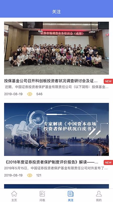 投保基金调查是一款针对投资者保护基金公司设计的调查反馈平台,针对所有的证券投资者开设了公开的建议和意见反馈渠道;主页面中设置了调查通知栏,随时都能在该栏中看到最新的公司调查信息,这些信息中涵盖了不同阶段中发布的相关调查问卷内容;从主页的关注新闻中还可以实时了解到关于本平台公司最新的动态消息,透过这些消息内容可以关注到公司内部的各种培训以及公司的各种报告统计资料;用户在该软件中不仅能通过问卷调查的方式将自己的投资意见反馈,同时还能在作答问卷的过程中获得平台专属的基金答卷奖励。