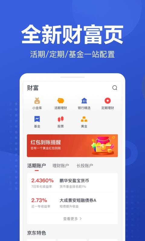 京东股票是一款提供金融理财的软件,能够帮助用户快速的进行使用,海量的理财资讯全部展示在平台里,用户可以快速的进行查看,实时的满足你的使用需求,让你在平台里可以获得优质的服务,稳定的进行投资;平台向投资者提供专业、及时、全面的行情及理财服务,帮助用户了解更多的理财信息,你可以根据自己的情况快速的进行选择,获得更多的理财方案,让用户可以更好的进行选择,快速的进行使用,非常的方便;同时平台提供的内容非常的丰富,涵盖银行理财、小金库活期理财、黄金TD交易等内容,在线就可以实时的进行使用,得到优质的服务。