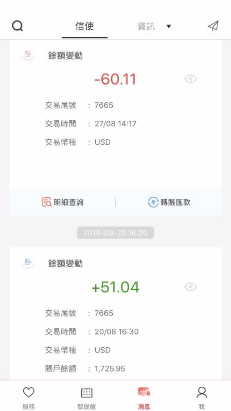 4、快捷的余额变动消息查询标签,每一条余额变动消息卡片中都设置了快捷的明细查询以及转账汇款查询标签;