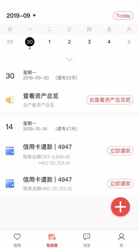 3、设置智能还款提醒,在智能提醒中心使用添加功能添加自己的信用卡还款提醒等;