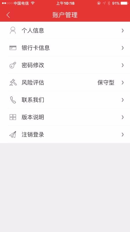5、在账户管理页面,选择个人信息、银行卡信息、密码修改、风险评估等