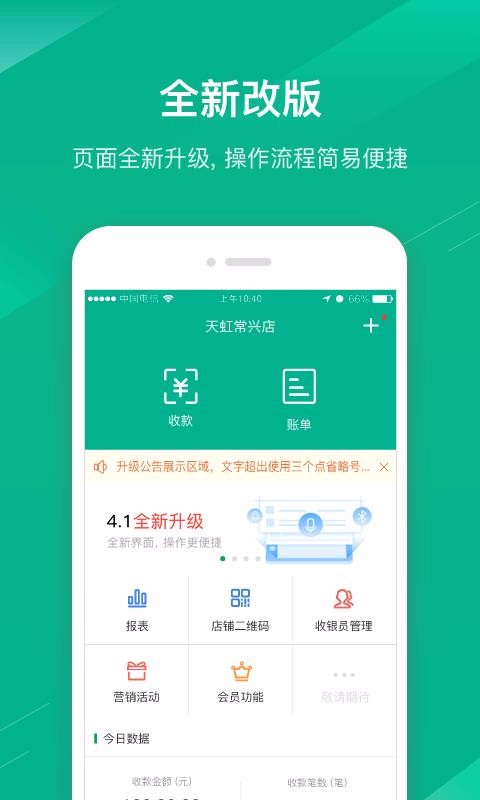 蓉e扫app是专为商家打造的一款收银工具软件,通过丰富的应用功能,为用户提供一站式收银服务,让每个用户都能高效、便捷收银;商户可以在这里随时管理自己的店铺,实时查看店员的工作情况,还能随时发布各种优惠活动,完全由您自己设定优惠的具体形式,以及对于不同的客户采取相应的优惠福利;您可以开通微信、支付宝和京东钱包等多种支付方式,能够为消费者提供多种支付选择,在为自己带来便利的同时也为客户提供了方便,让您的生意更火爆;应用还能自动为您统计和分析各种数据,是您的贴心小管家。