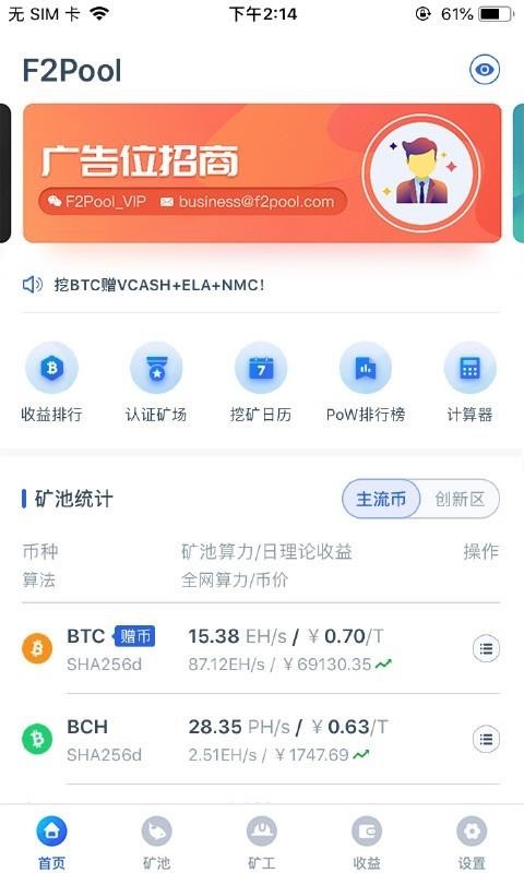 2、在首页中查看矿池统计信息,了解各币种的收益和价格变化情况