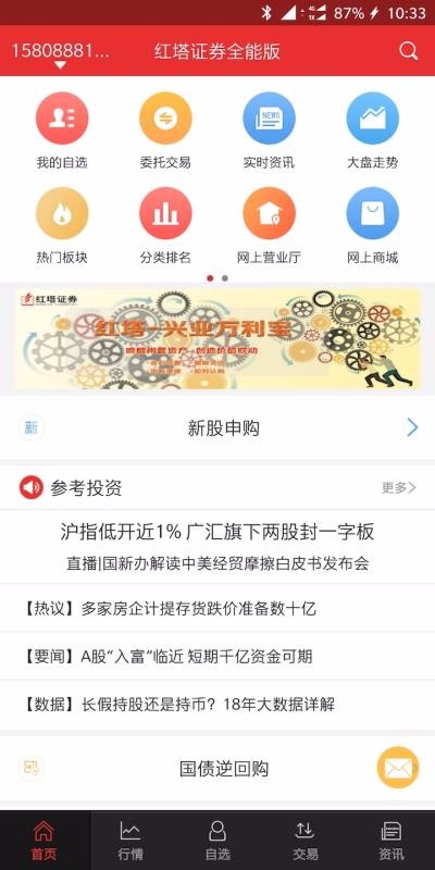 红塔证券全能版app是一款可以查询股市行情的智能软件;这里致力于为你的投资保驾护航,能够让你清晰的知晓实时的行情,让你更加明确的进行投资,有机会获得更多的收益;这里可以实时的记录你的交易信息,能够随时的查询相应的内容,可以进行新股申购以及银证转账等,让你的查询更加的价值;实时的记录你的资产,可以查看到每日的盈亏数据,能够实时的帮助用户进行统计等;这里还有众多的资讯推送给用户查看,可以查看到更加丰富的资讯,让你有更多的专业知识,投资理财可以更加的专业,降低更多的亏损等。