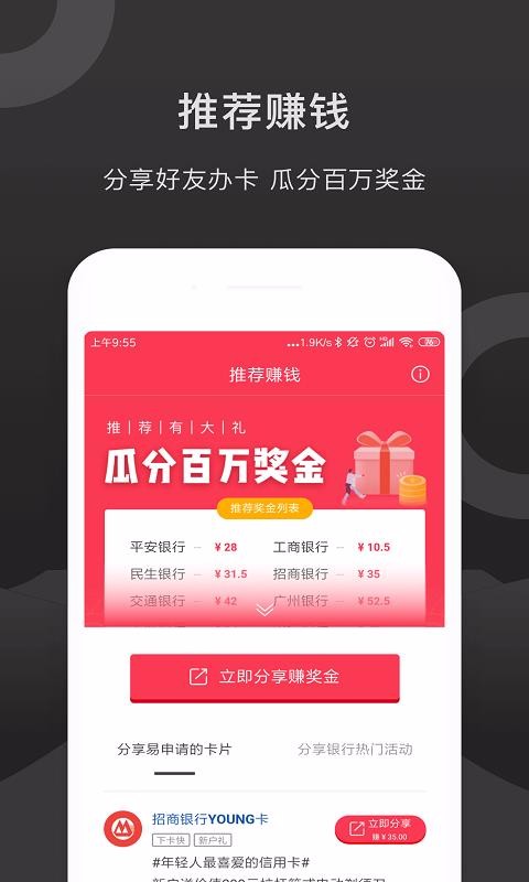 4、支持推荐赚钱,选择类型分享到其他平台即可瓜分银行提供的奖金;