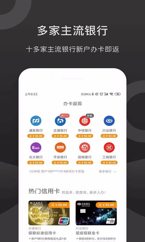 4、汇集了多家主流的银行,新户办卡即可获得返现,所有银行统一为你展示在首页;