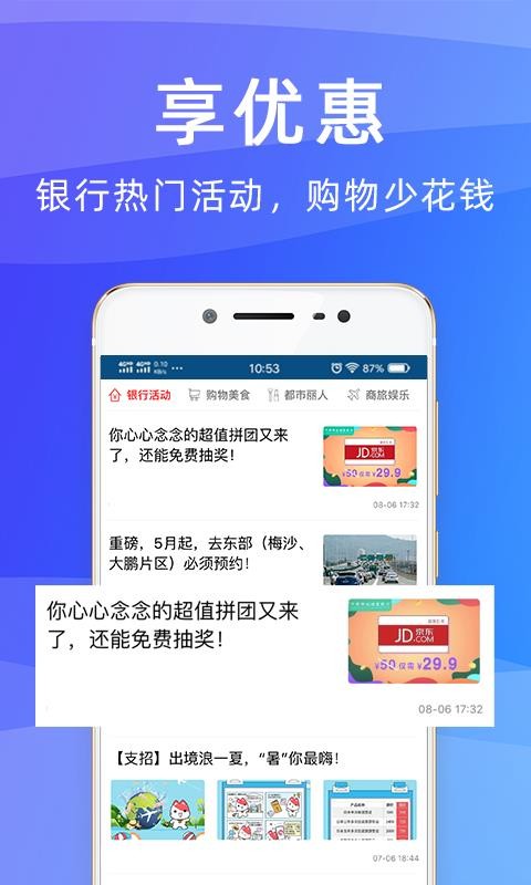 5、打开活动版块,查看各种银行活动和购物活动,享受更多优惠