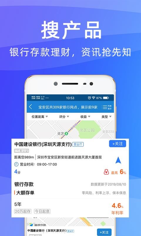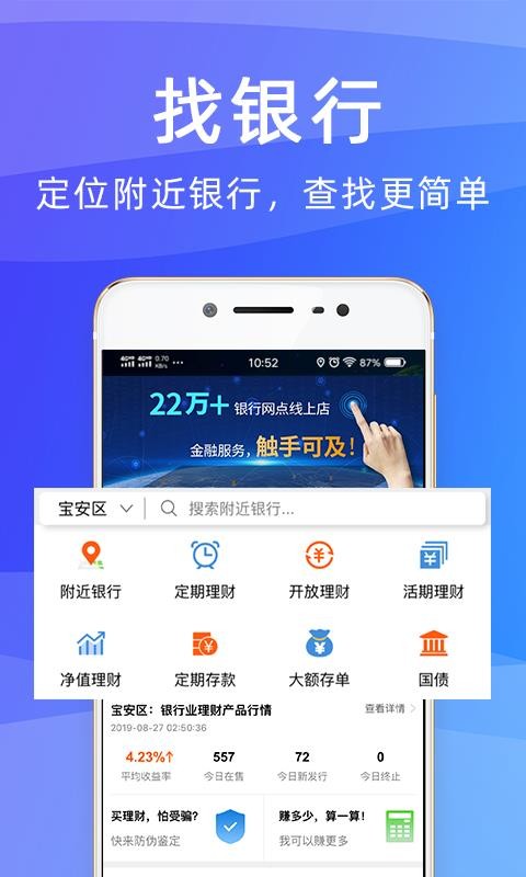 万融网app是一款金融软件,让用户能够轻松的找到各个银行和产品的信息,方便用户进行银行存款和理财;应用中有多种功能,用户可以快速的查找各个银行的详细信息,了解各银行的位置和详情,从而能够轻松的前往银行办理各种业务;用户通过软件可以搜索到各个银行的产品信息,了解各种理财产品的详细利率,快速的进行理财;在这里,用户还可以找到各种银行相关信息,了解各银行举办的活动内容,快速的参与活动,享受更多的购物优惠;快下载这款软件试试吧,轻松的找到各个银行信息,了解银行的产品详情。