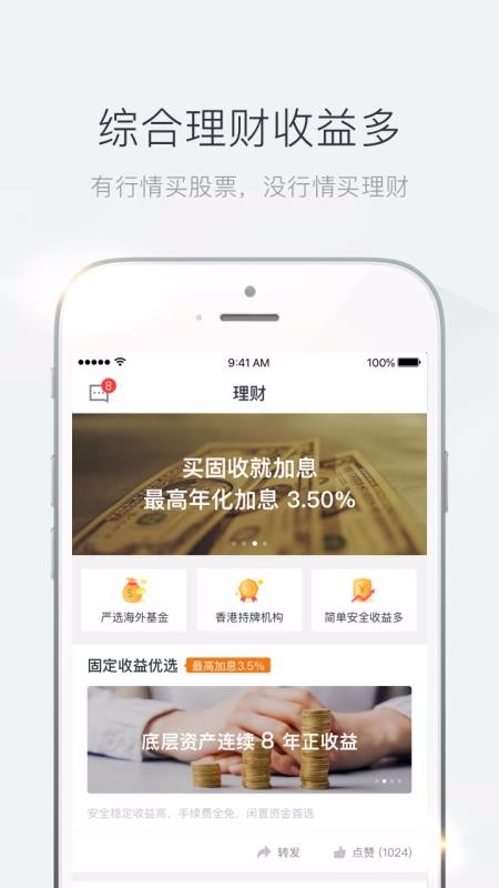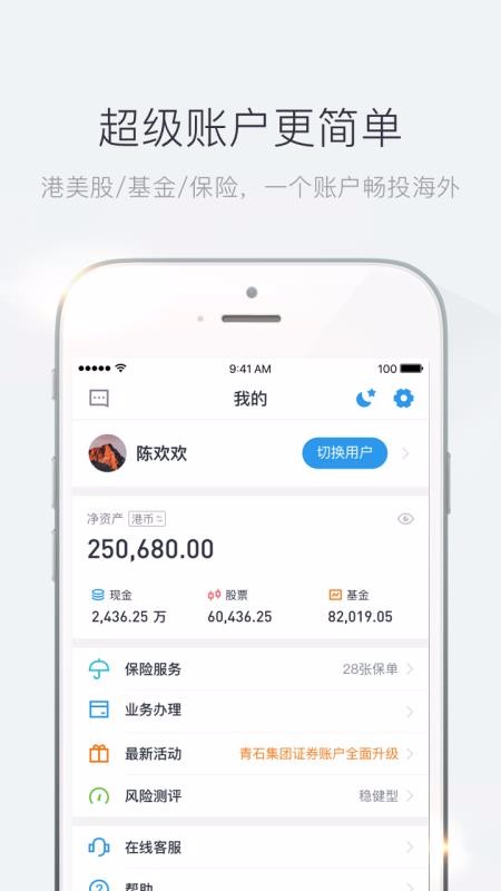 6、清晰展示自己的财富资金,在个人中心能看到自己净资产以及现金、股票与基金的数据;