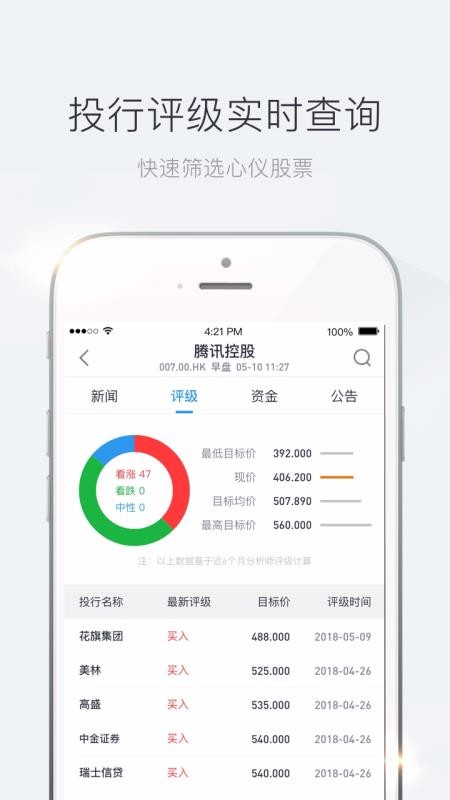 5、拥有丰富清晰的评级数据展示,里面提供了环状占比图以及最低目标价、现价、目标均价等数据;