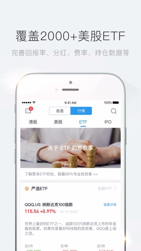 1、提供了丰富的行情栏目,拥有港股、美股、ETF以及IPO多种资讯栏;