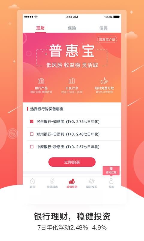 普惠通app是一款为用户提供各种金融和生活服务的软件,让用户能够轻松的进行各种生活缴费,体验便捷的银行服务;应用涵盖了多种银行业务工具,让用户能够轻松的办理各种银行业务,快速的进行各种金融操作,满足不同用户的需求;用户通过软件可以找到各种各样的理财产品,轻松的进行购买,让自己能够获得一定的理财收益;在这里,用户还可以找到各种生活便利服务,让自己的生活变得更加轻松、便捷,提高自己的生活品质,省钱又省心;快下载这款软件试试吧,体验各种生活便利服务,轻松的办理各种银行业务。
