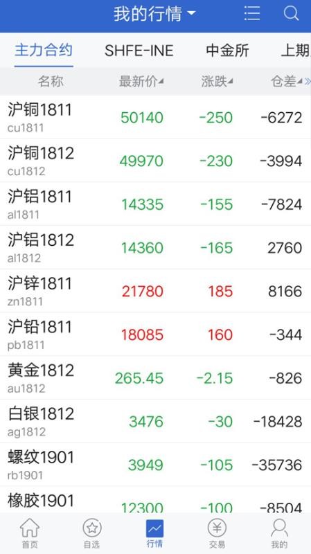 3、点击行情,查看各种期货的详细价格信息,了解涨跌幅度和仓差