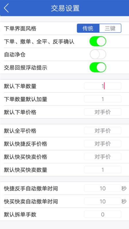 5、打开交易设置,切换下单界面风格,开启各种功能,修改下单数量和价格