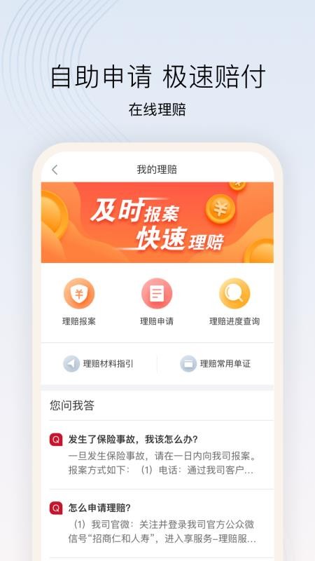 1、理赔报案,发生人任何保险事故,用户能够自由选择方式向公司报案;
