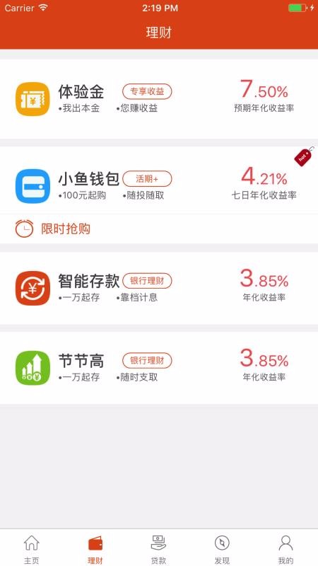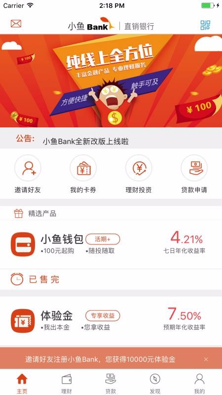 小鱼Bank是一个在线金融服务平台,可以在该平台中进行理财,推荐了各种理财产品,并都是属于银行理财,每个产品都标注了起购金额、随投随取、靠档计息、年化收益率等;也会推送各种热门活动,比如有体验金专享、每日签到、虾米兑换、幸运抽奖等,而用户邀请好友使用该软件也可以获得奖励;支持在线贷款,提供了各种贷款渠道,选择类型后按照操作即可直接获取资金;用户在该平台中开通账户后,所有的收益都会汇入该账户,同时该软件与银行和合作,为你提供了安全保障;当用户遇到使用问题时,可以在帮助中心进行查看。